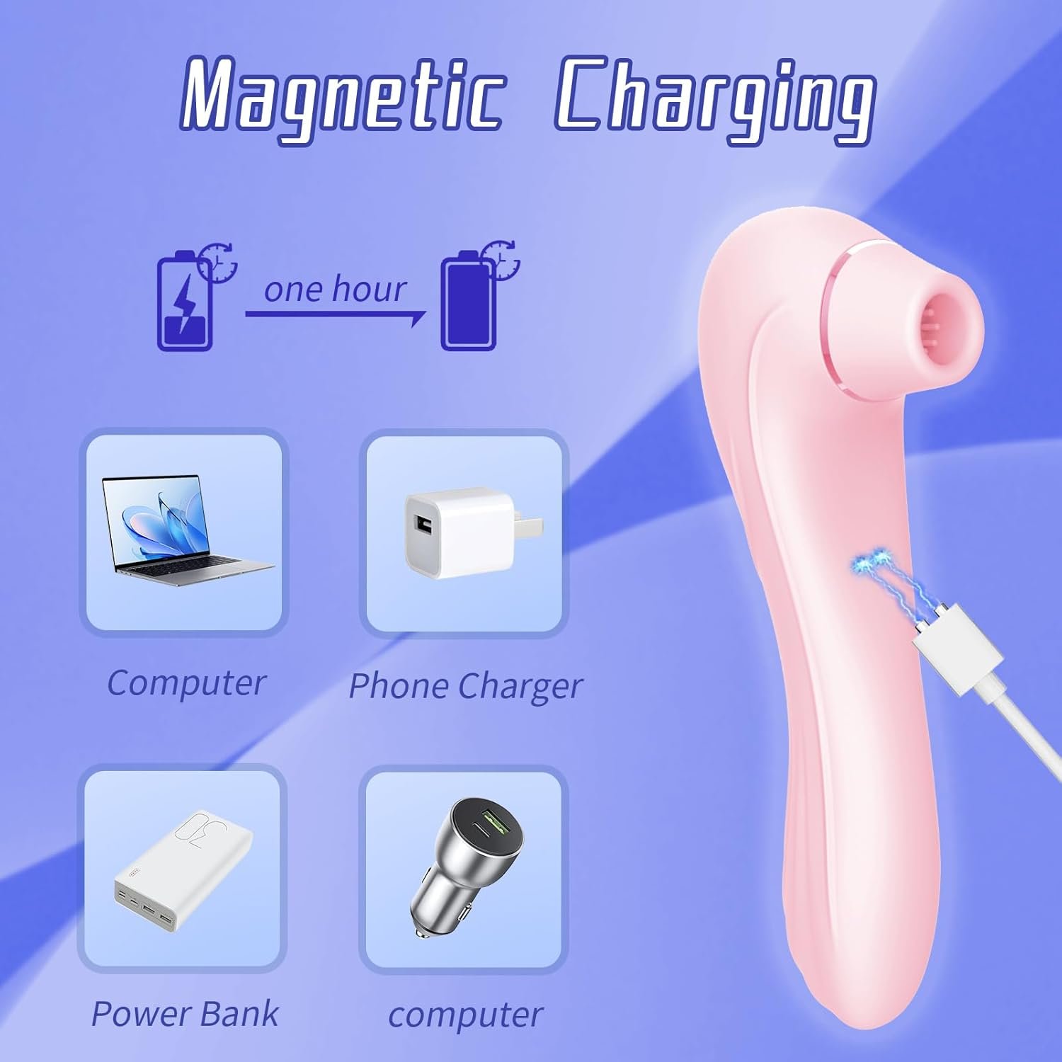 * Silicone+ABS.* Purple,pink,light pink,OEM.* 10 suction modes+10 vibration modes+rechargeable.* 100% waterproof.* Diameter:1.38"/3.5cm.* Length:7.48"/19cm.* Magnetic charging.