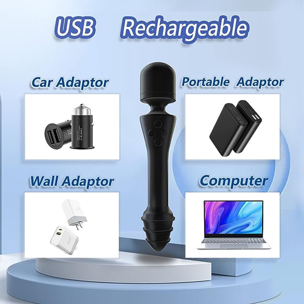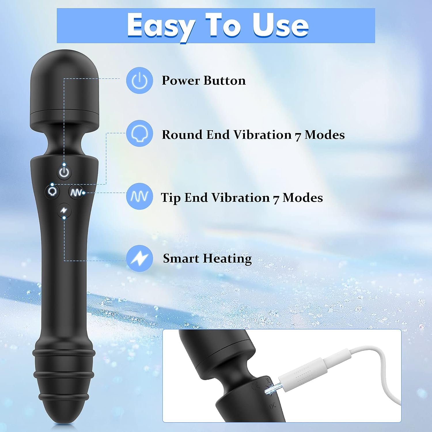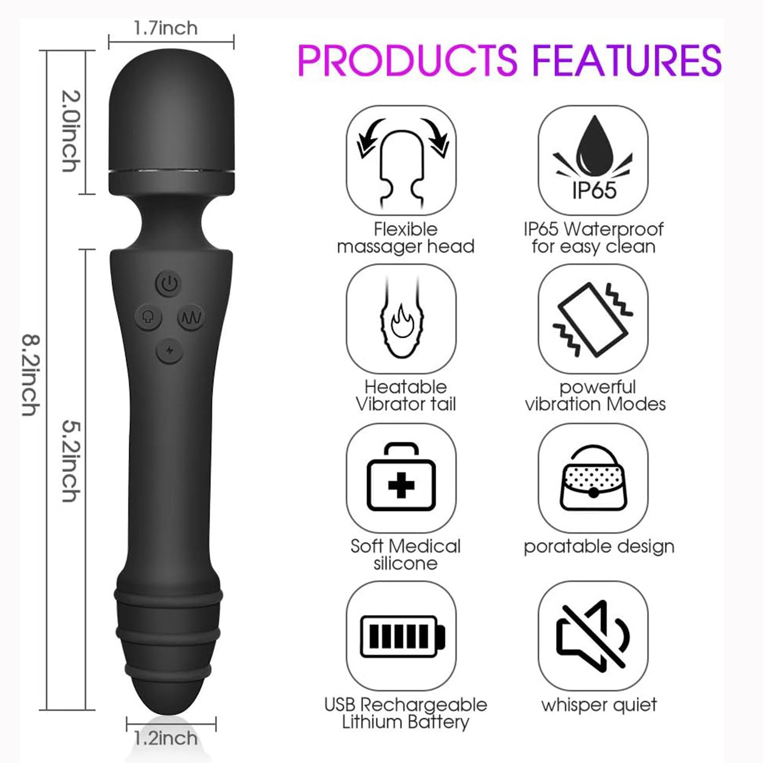 * 7 vibration modes(head).+7 vibration modes(tail)+heating function+rechargeable.